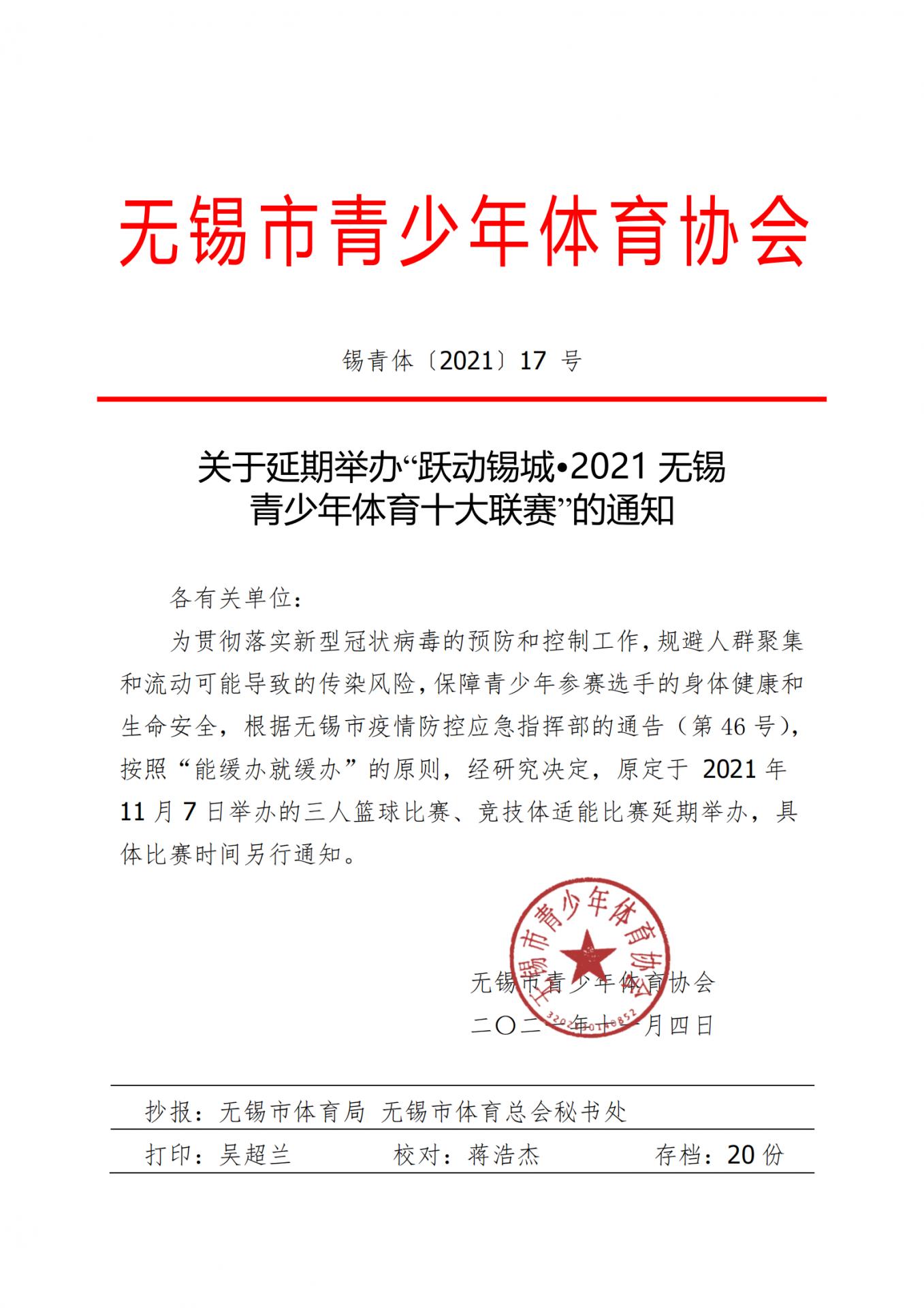关于延期举办“跃动锡城·2021无锡青少年体育十大联赛”的通知